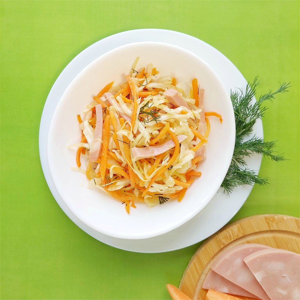 Свежая капуста, ветчина, морковь по-корейски, зелень, растительное масло