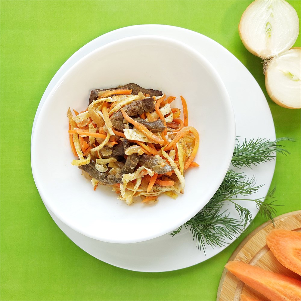 Печень говяжья, морковь по-корейски, омлетный блин, лук жареный, майонез