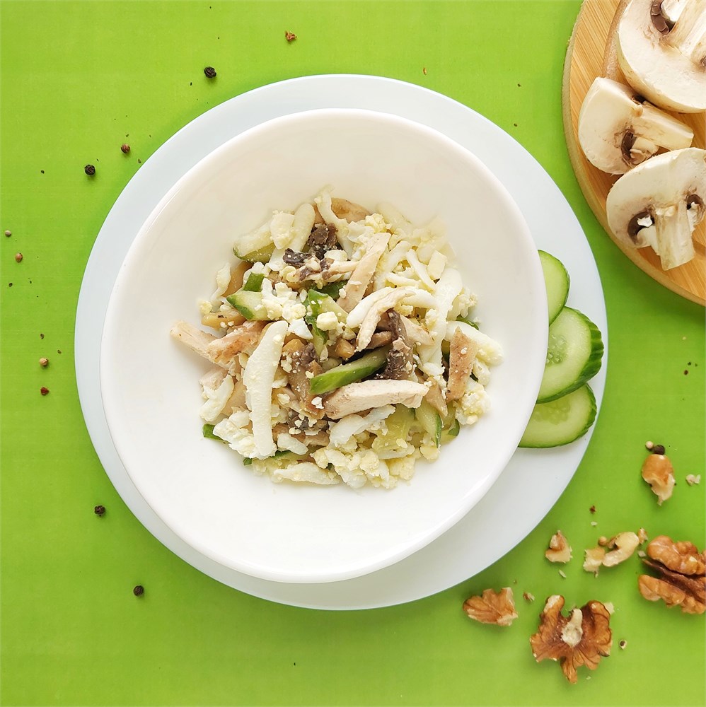 Курица запеч, шампиньоны жар, огурец, яйца, грецкий орех, майонез.
