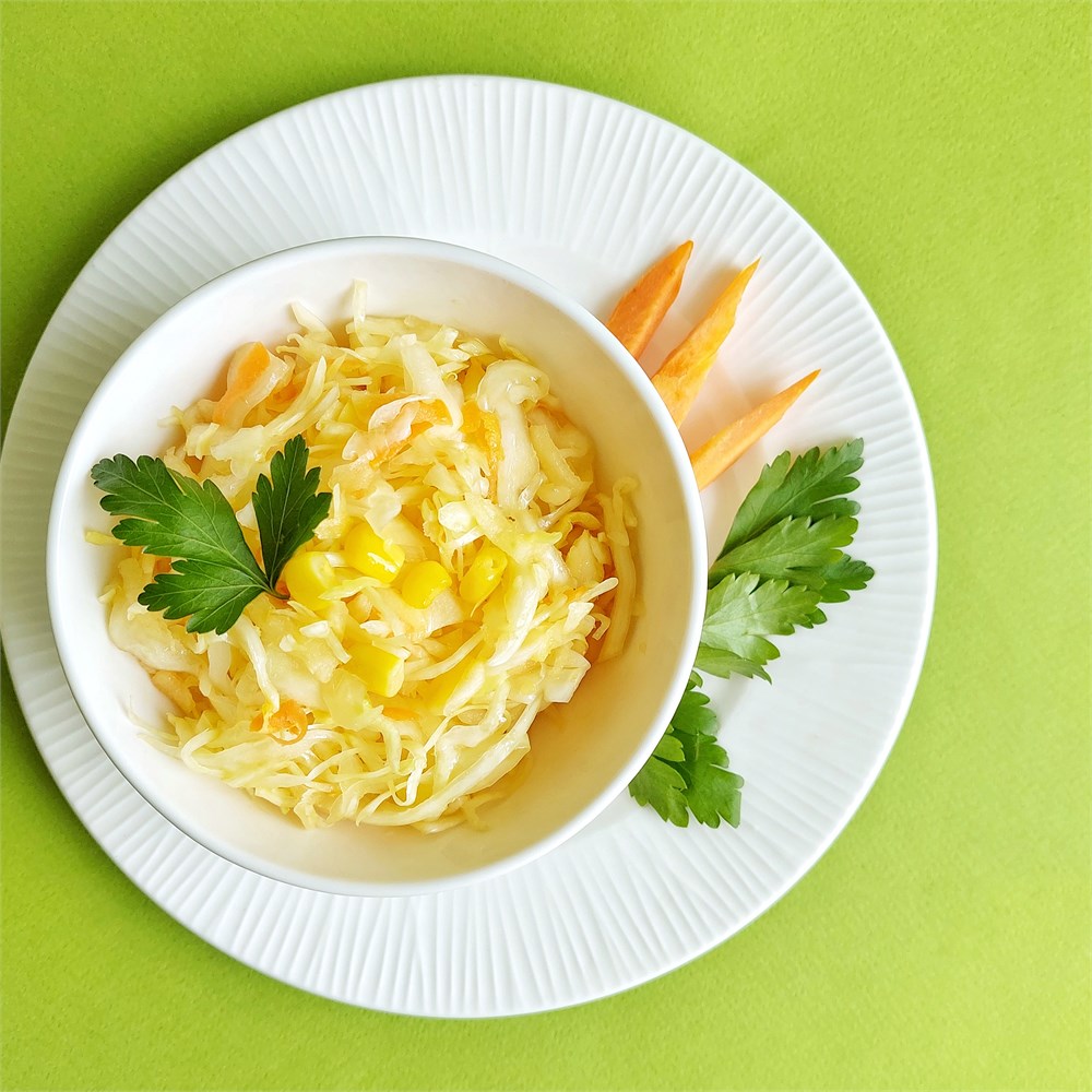 Свежая капуста, морковь, яблоко, кукуруза, зелень, заправка