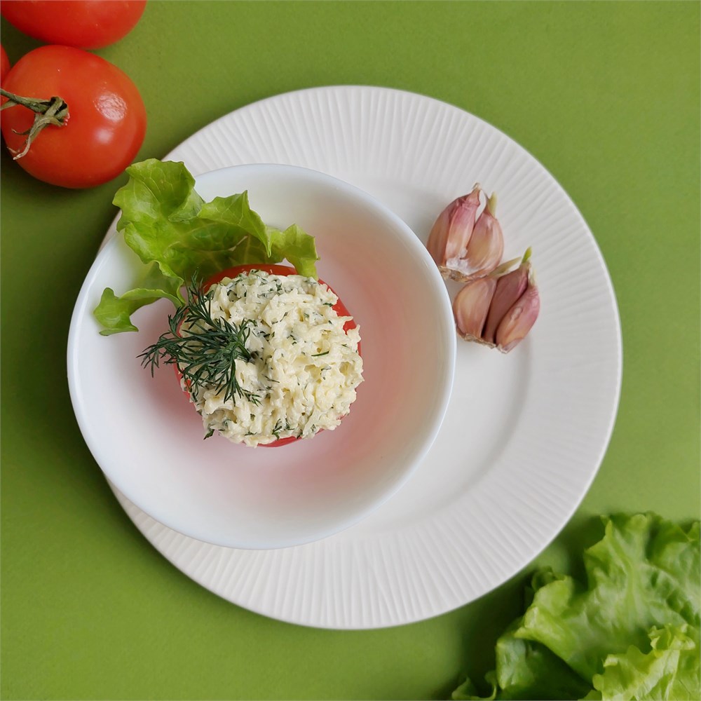 Свежие помидоры, сыр, майонез, чеснок, зелень