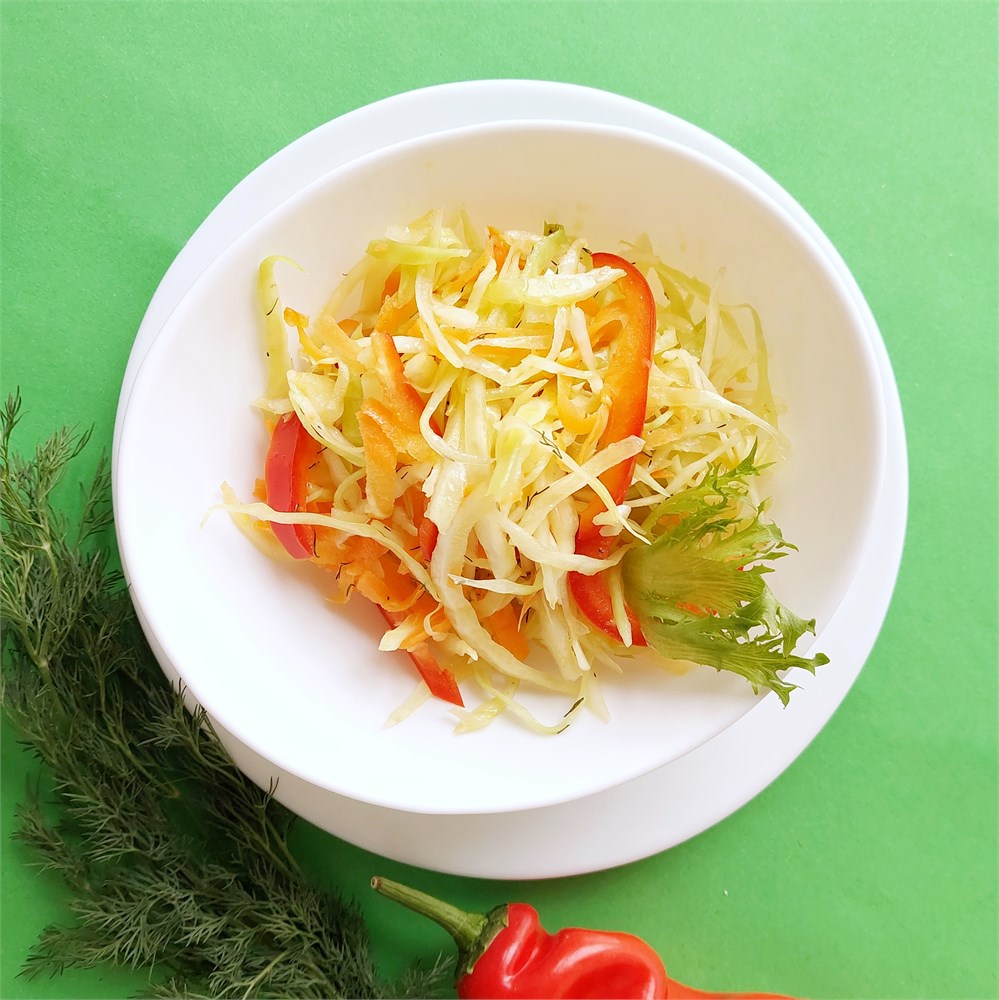 Свежая капуста, огурец, перец, помидор, заправка, зелень