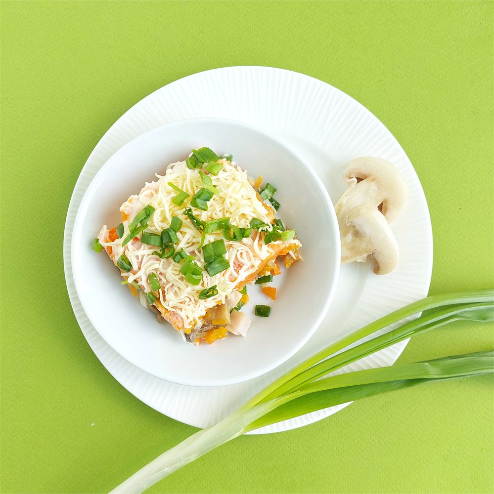 Ветчина, шампиньоны, картофель, морковь, сыр, яйцо, майонез, зеленый лук