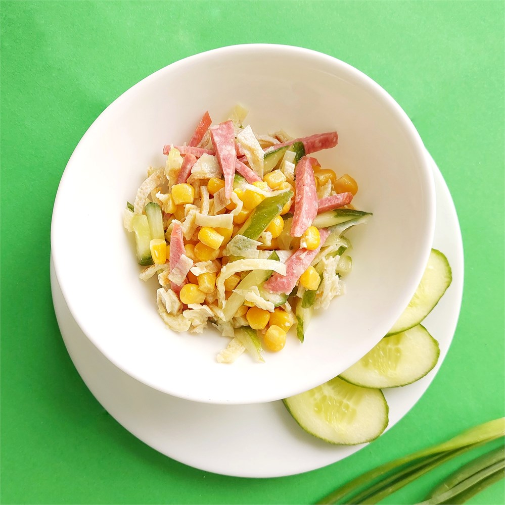 Колбаса п/к, кукуруза, огурец, омлетный блин, соус сливочно-чесночный